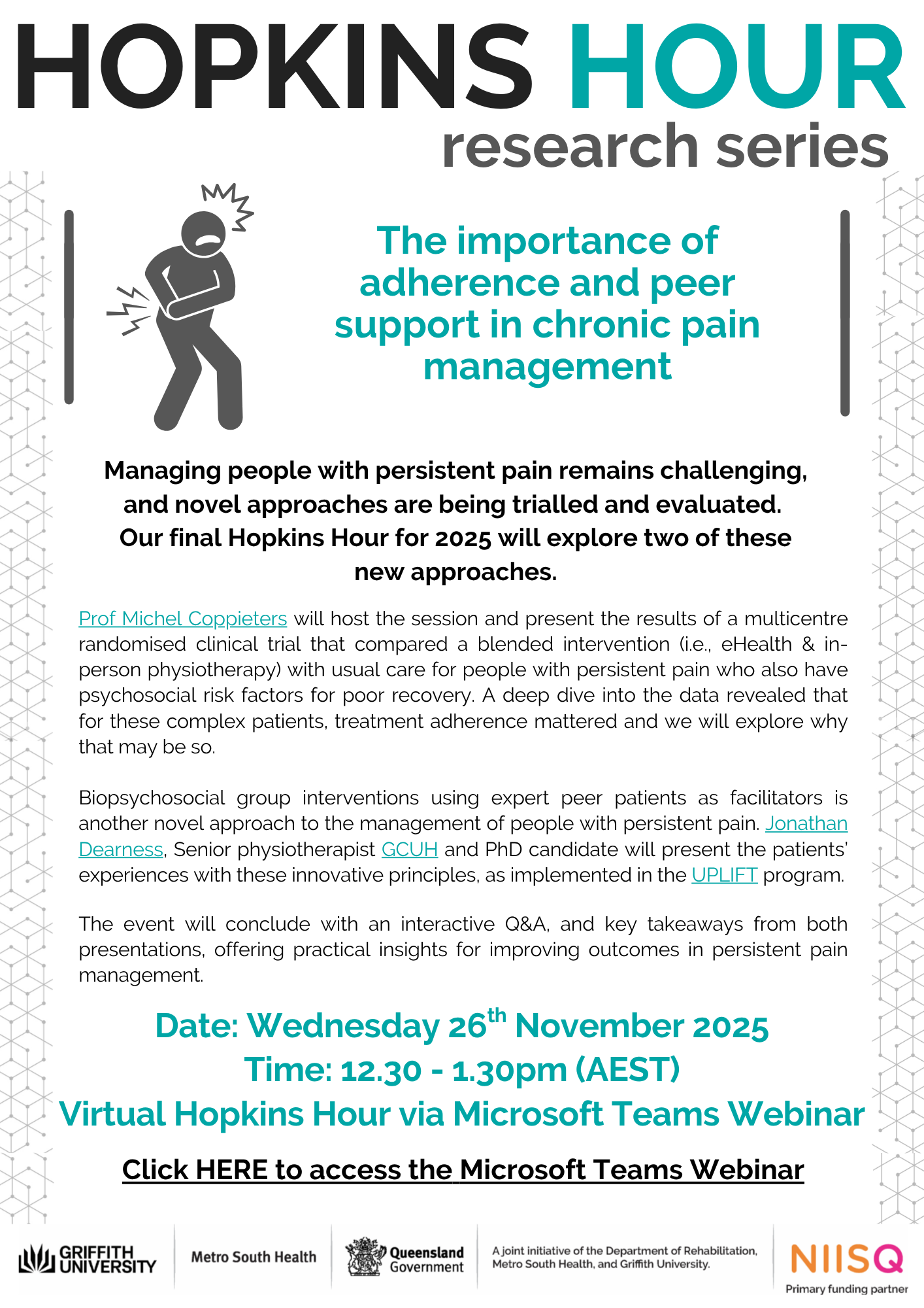The importance of adherence and peer support in chronic pain management, being hosted by Prof Michel Coppieters (Professor Griffith University), with Jonathan Dearness Senior clinician at GCUH (Physio) and PhD candidate at Griffith University.