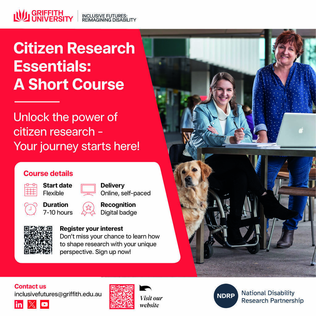 Citizen Research Essentials led by Dr Kelsey Chapman and Rebekah Barker, is an innovative online micro-credential co-designed by Griffith University and people with disability, and sponsored by the National Disability Research Partnership. The course equips people with disability with the knowledge and practical skills to become citizen researchers — taking active, leadership roles in research projects grounded in lived experience.